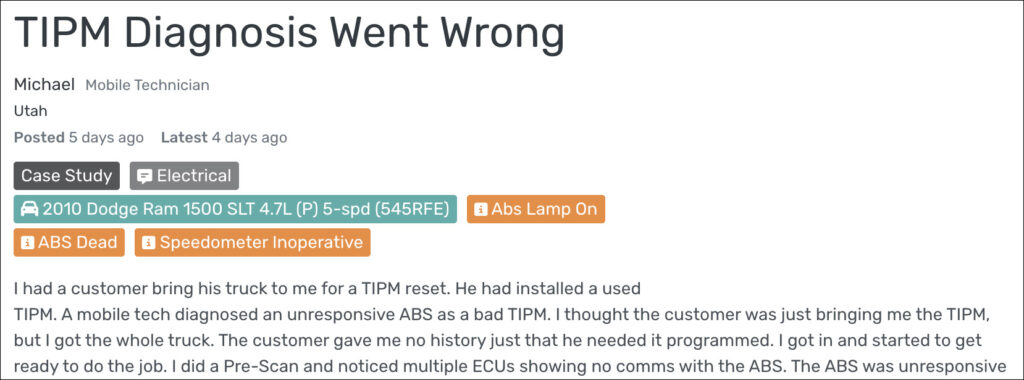 Here’s a great case study, provided by our friend Michael in Utah, related to a 2010 Dodge Ram 1500 SLT that his customer brought to him for a TIPM reset. As expected from Michael, he dug into the problem vehicle prior to performing the TIPM reset and really didn’t like what he saw, which included no comms with the vehicle’s ABS system (the reason the customer installed a replacement TIPM in the first place).